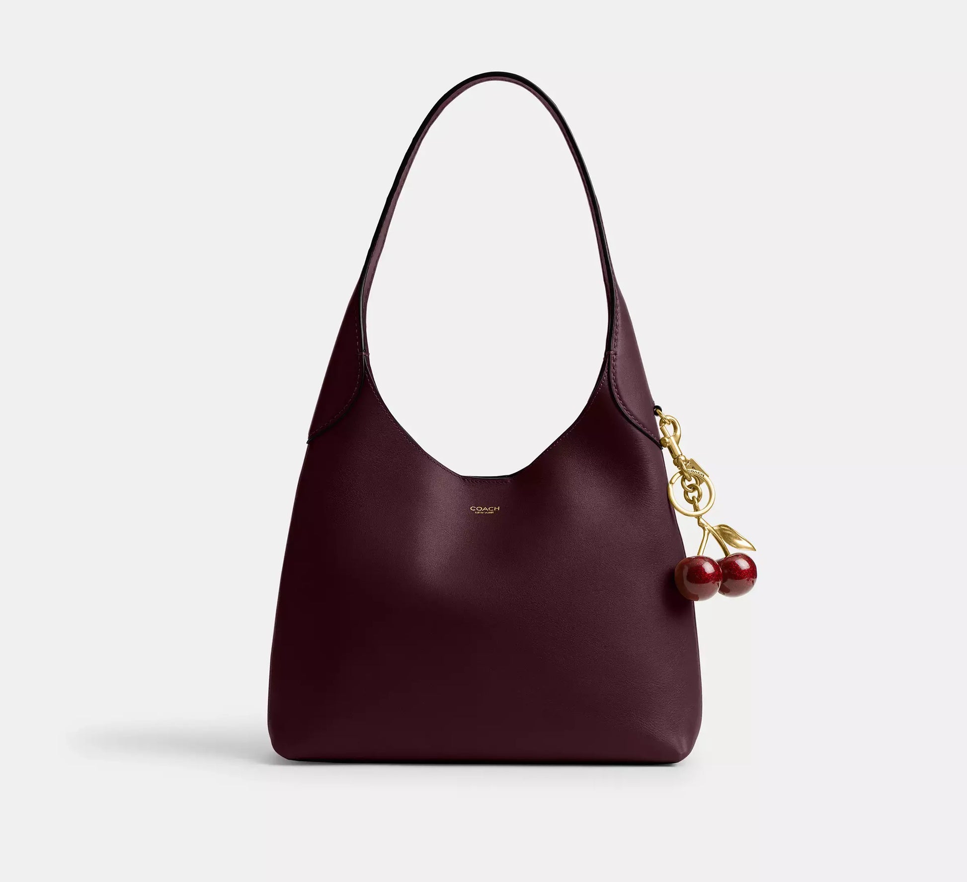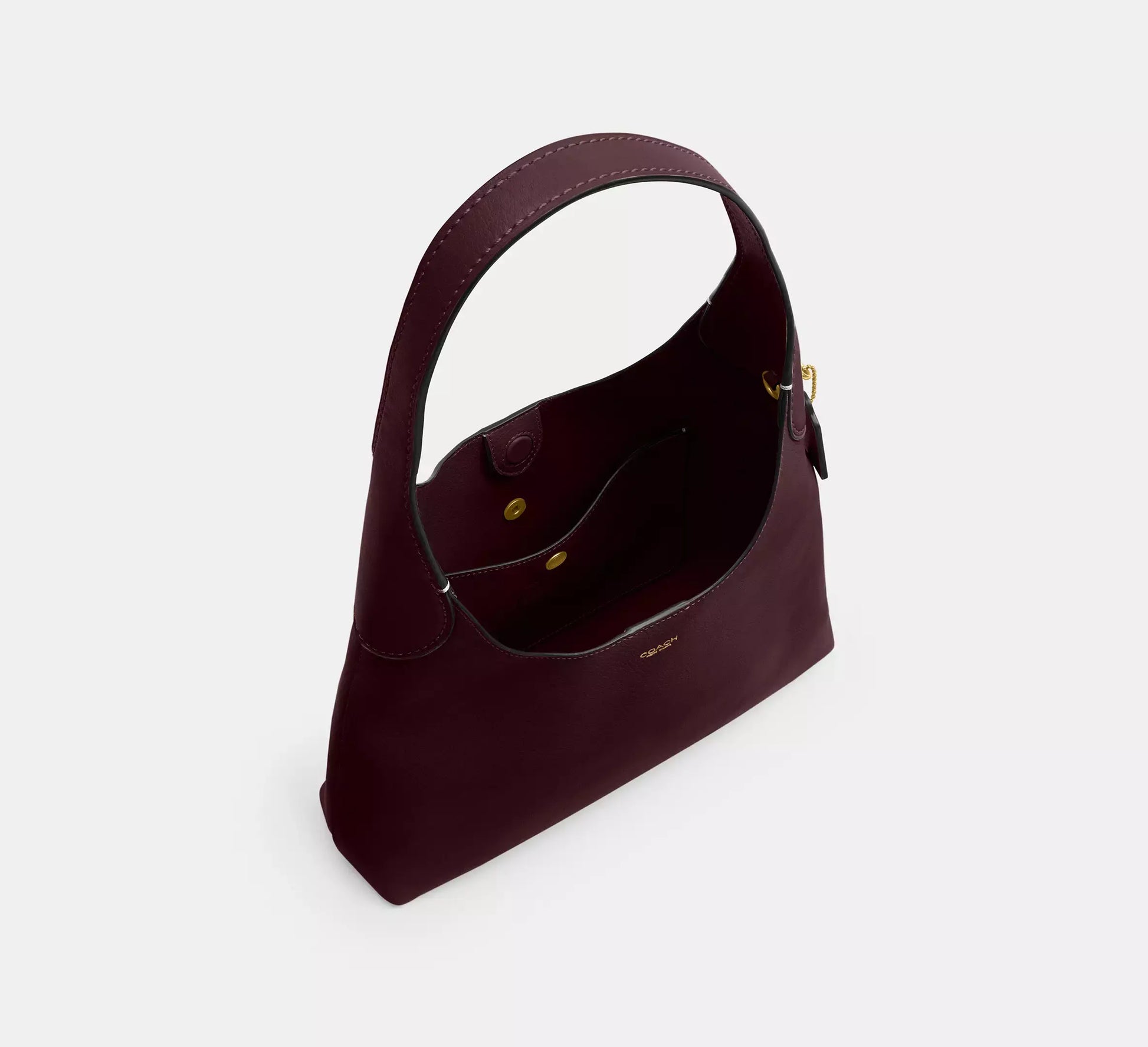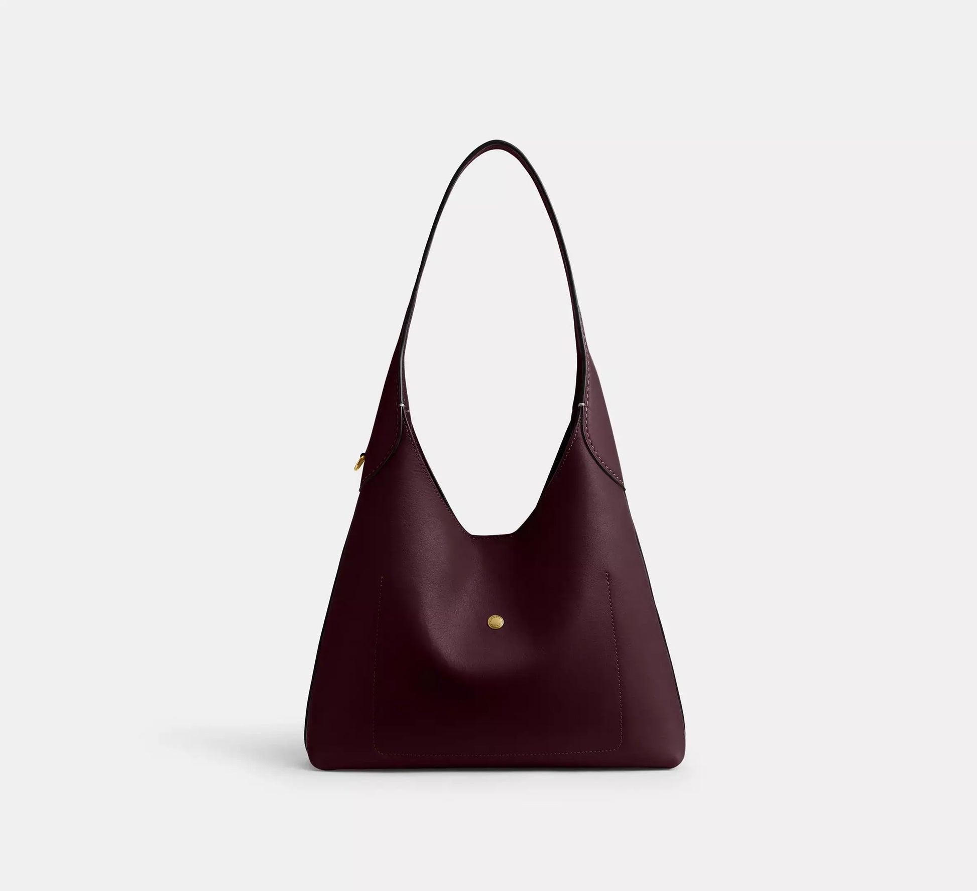 Crafted from polished pebble leather, this bag features a detachable 8.5” handle, 21.5” crossbody strap, multifunction pockets, and a snap closure.